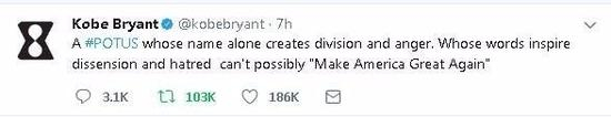 科比写道:“单是特朗普的名字就能带来分裂与愤怒,言论更是激起不和与仇恨,这样是不可能让美国变得更好的。”