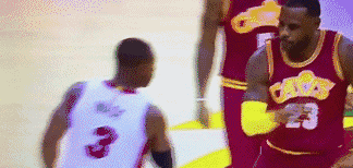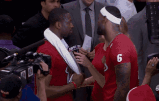 这张图是在2013-2014赛季詹韦带领迈阿密热火队卫冕NBA总冠军后,两人激动相拥,说着悄悄话。也许他们在说:“雷-阿伦真关键啊,帮我们又拿了一个总冠军。”