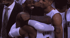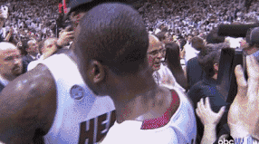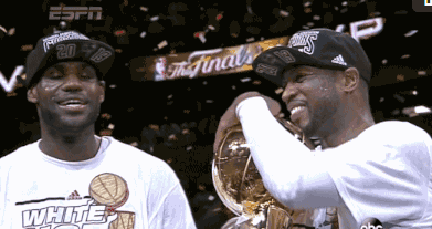 2012-2013赛季总决赛,迈阿密热火在主场赢下总冠军,比赛结束前被换下场的詹韦两人已经不关系比赛最后的分差,紧紧的抱在了一起,庆祝他们在一起赢下的第一次总冠军。独留着一旁的肖恩-巴蒂尔一人观看着还在进行的比赛。
