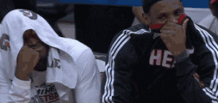 这张动图中詹韦居然都害羞了,也许是想恶搞摄像师,韦德用毛巾遮住自己的头部,露出一点点脸部,而詹姆斯也是拉起外套的领子遮住嘴巴,两人节奏同步。