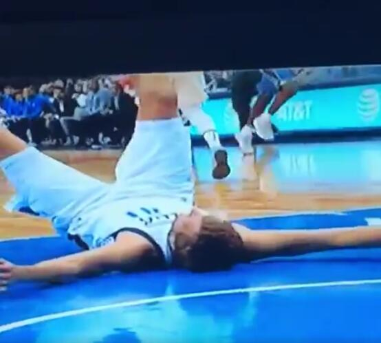 北京时间10月10日,NBA季前赛,小牛在主场以96-85战胜魔术。比赛中,小牛队39岁老将德克-诺维茨基在一次回防过程中没有和任何人发生身体接触,结果却因为重心不稳而摔倒在地。