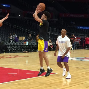 按照这个逻辑,今年备受瞩目的另一位榜眼、赌城夏季联赛MVP鲍尔自然也会得到一个与英格拉姆同等地位甚至更好的更衣室位置。季前赛就提前开放的湖人队更衣室揭晓了答案,鲍尔的更衣柜同样在英格拉姆那一排。处在左起第3个位置。既没有把边,也没有在旁边空出另一个闲置的更衣柜,旁边的柜属于库兹玛。