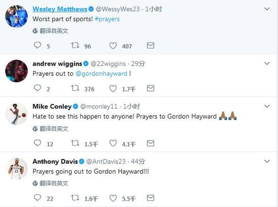 不仅是在场上,场外的NBA众将在得知海沃德受伤之后,也纷纷为他祈祷。