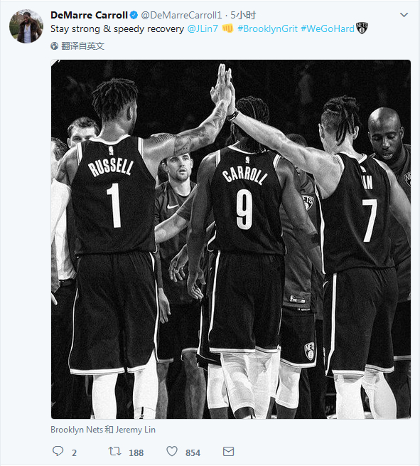 此外,篮网队的众多球员也纷纷在推特上为书豪祈福,侧翼德玛尔-卡罗尔写道:“保持坚强,快点康复。”