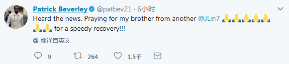 “听到了(林书豪赛季报销)的消息。我正在为我的兄弟林书豪祈祷,希望他快点康复!”今夏被交易到快船队的贝弗利在推特上写道。