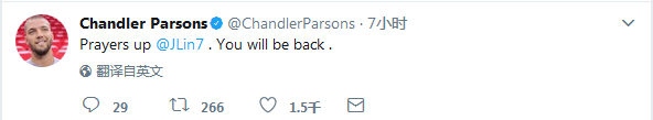 作为书豪在火箭队时的最好朋友,灰熊队前锋帕森斯今天也在推特上@书豪,并写道:“为林书豪祈祷。你将会回来。”