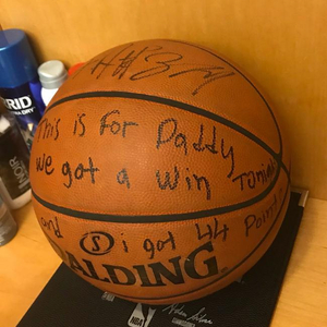 赛后,字母哥在比赛用球上面写下一段话,来纪念亡父。