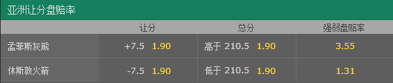 北京时间10月24日08:00,丰田中心将迎来劲敌——孟菲斯灰熊。灰熊队此前凭借顽强的防守111-101力克卫冕冠军勇士队,豪取2连胜,而火箭队自新赛季以来三战全胜。本场双方为自己的“不败金身”而战,博彩公司为此开出了赔率,火箭主场赢球的赔率达到1.31,更看好火箭豪取四连胜。