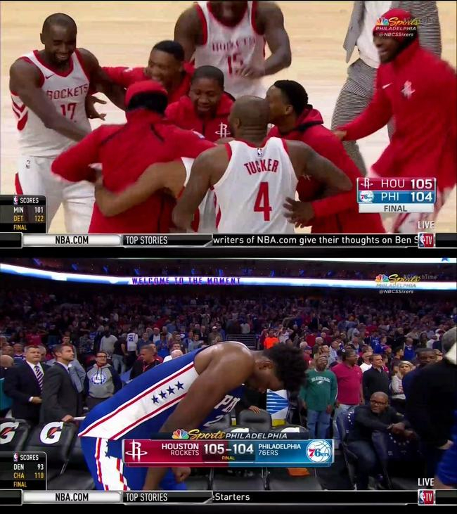 在本场终场哨响之时,《雅虎体育》官方推特立刻晒出了双方球员的表情对比图。和76人球员低头沉吟不语相比,火箭球员则欢快地围成一圈,而圈中的核心人物则是戈登。