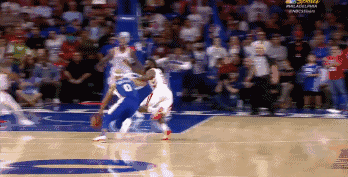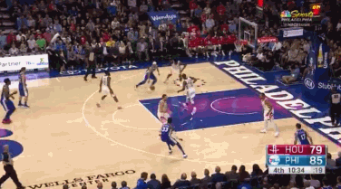 终场前2分08秒,哈登三分不中,但立刻机敏抢断西蒙斯,给了戈登赚得罚球机会。随后雷迪克2次错失关键三分,哈登抓住良机,一次妙传克林特-卡佩拉完成空接,一次扛着炸药包突入内线,在双人夹击下将球扔出,造成恩比德干扰球,还打成2+1。此球恩比德在落地时重重砸在哈登身上,令火箭一哥躺了许久方才起身,堪称是拼命搏来三分。