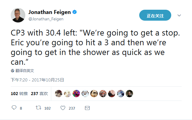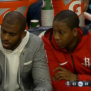 赛后据火箭记者乔纳森-费根报道,因伤缺阵的克里斯-保罗对于绝杀的这一切似乎早已预料到了,所以在比赛还剩30.4秒时他对队友说了以下这些话: