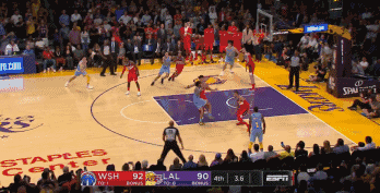 第四节最后12秒,湖人以90-92落后2分,湖人主帅沃顿布置战术,将最后一攻交给了英格拉姆。英格拉姆高位持球,面对乌布雷的一对一防守,英格拉姆强起三步,眼看机会不好,却非常聪明地将球扔向篮筐,然后利用自己的长腿长臂和二次弹速,再度起跳,在人群中探出手将球一拨,皮球在篮筐上涮了一圈,还是滚入了篮网,92-92平!