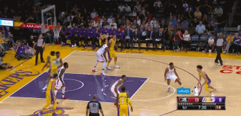 今天一开局,球哥就利用上篮得到自己的第一分。面对球哥冲击篮下,猛龙倒也不设防,大门打开就给球哥得分。不过,球哥这样的得分机会在今天并不多见,很多时候,他都在为其他队友而搭桥。