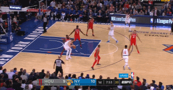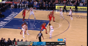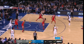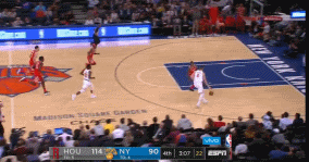 尼克斯头号进攻箭头被限制,整体表现自然无法和火箭队抗衡,三节结束之后,场上比分已经变成74-100,比赛提前进入垃圾时间。