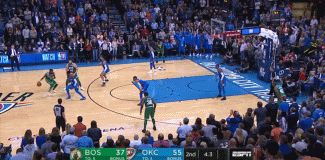 下半场开始后,雷霆的命中率明显下降,凯尔特人趁机追分。第三节还剩4分28秒,欧文又在左侧45度投进一个快攻三分,凯尔特人追到只差6分,从而迫使雷霆喊了暂停。暂停过后,欧文显然找到了状态,他通过突破和中投连得6分,凯尔特人一下子只落后2分。
