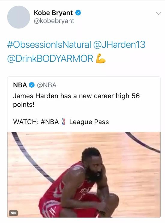 今天的精彩表现也引得黑曼巴科比转推致敬 #天性!@詹姆斯-哈登。