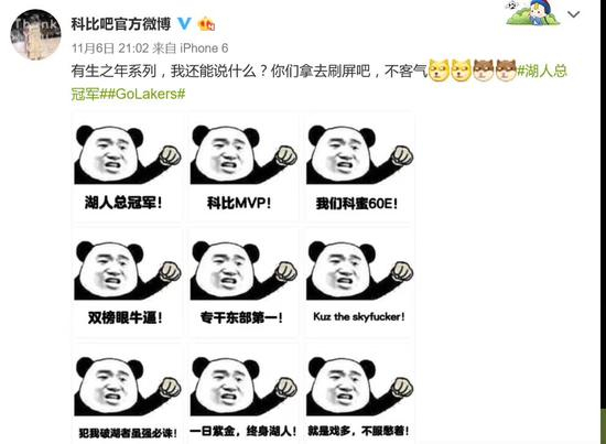 微博网友们集体给力攻陷CCTV5官微,来源于科比吧官方微博更是做出一组“湖人总冠军”表情包。不好意思,E妹在办公室里笑出了声。中国网友的智慧是无敌的,中国湖人球迷的力量是无敌的!