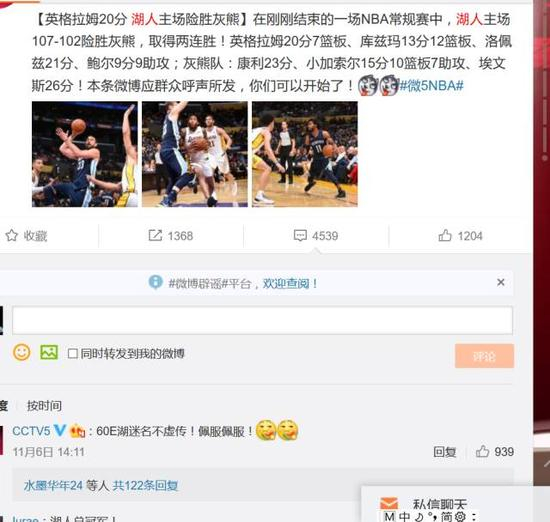自从11月1日湖人终结活塞三连胜之后,E妹发现在微博中竟然发现了一股清流,湖人球迷纷纷在CCTV5的官方微博下留言:湖人总冠军!队形一致,步调一致,令人瞠目结舌!