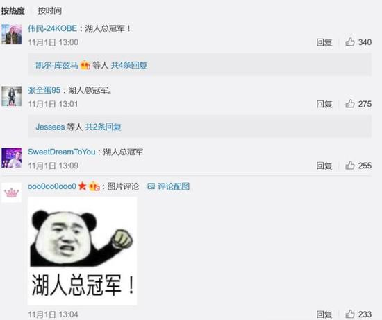 看到球迷们如此疯狂,就连CCTV5也开始卖起萌来,60E湖迷名不虚传!佩服佩服,最后再添俩吃瓜群众的表情。这条微博下留言数达到4000+,清一色的湖人总冠军。。。厉害了,我的湖蜜们!
