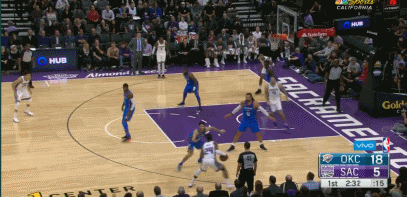 今天国王迎战雷霆,第一节就被打蒙,国王的首发阵容没有得分能力,最多时落后雷霆17分。第一节后半段替补出场后,希尔德只是命中了一个中距离跳投,但是当第二节开始后,希尔德的手感爆发了,他连中2个三分球,吹响了国王反攻的号角。仔细看希尔德投进的这两个三分,他都是通过积极的跑动扯出空当,而且他的出手速度很快。