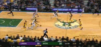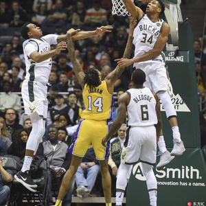 比赛刚开场,字母哥就在新秀库兹马和鲍尔头上奉献一个泰山压顶,内线亨森投篮不中,阿德托昆博飞身一跃骑在湖人两位小将头上补扣得手。