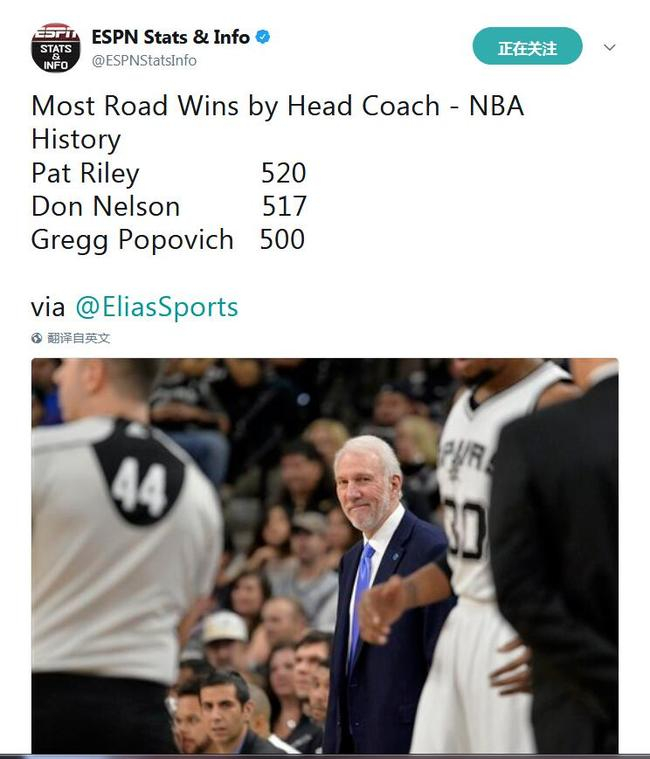 排在老爷子前边的两位分别是“神算子”帕特-莱利(520场)以及唐-尼尔森(517场),本赛季马刺队还有68场比赛,其中还有35个客场,以他们目前69.2%的胜率计算,他在赛季结束时的客场胜场将达到522场,彼时他也将超越莱利成为这个榜单上的历史第一。
