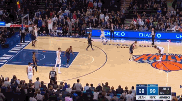 第四节中段,爵士还以93-91领先。不过此后他们连续投篮不中,尼克斯大举反击,比赛还有2分21秒时,波尔津吉斯三分命中,他们打出8-0后,以99-93反超。