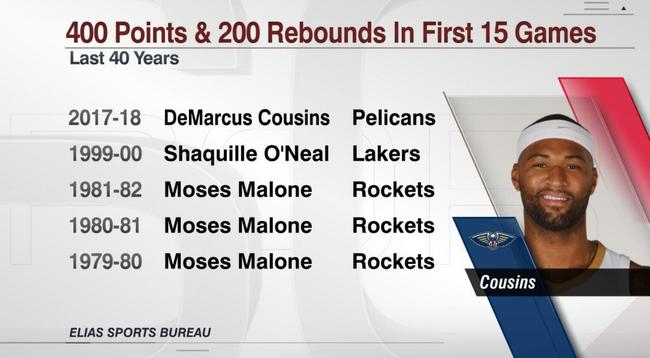 在今天比赛结束之后,考神在本赛季比赛数据总共拿到420分205板,他也成为近40年NBA中第五次能够在开赛前15场比赛拿到400分200板的人,前四次分别是火箭名宿摩西-马龙在79-80、80-81、81-82连续三次,以及99-00赛季的“大鲨鱼”奥尼尔完成,而同样以数据爆炸见称的安东尼-戴维斯也没能在前15场完成这一壮举。