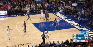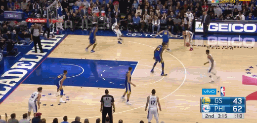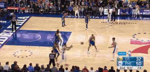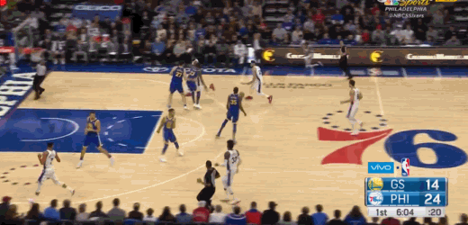 上半场,西蒙斯有一次单打勇士替补前锋卡斯比,当时西蒙斯左手运球,然后突然拉球转身,晃过卡斯比之后完成一个右手上篮。