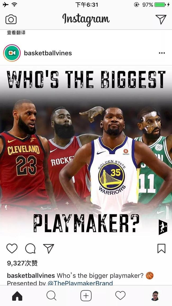近期一家名为《Basketball Vines》的媒体更新IG,发起了一项“谁是当今最佳playmaker”的调查,并列出了勒布朗-詹姆斯、哈登、欧文和凯文-杜兰特这4大候选人。