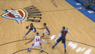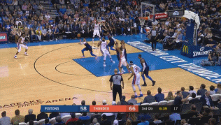 然而进入下半场之后,除了德拉蒙德的复苏之外,雷霆队全线进攻哑火。威少的个人进攻为雷霆化险为夷,第三节6分36秒,威少后场断球一条龙杀向前场,利用速度顶开斯坦利-约翰逊轻松上篮得分。