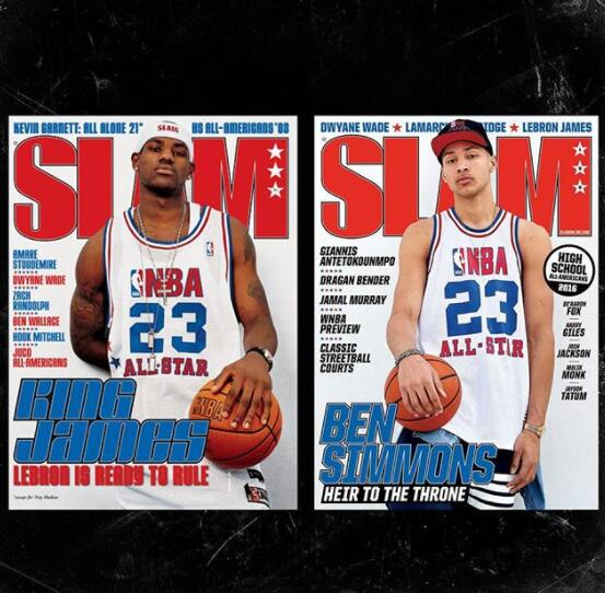 此外,《SLAM》杂志也别出心裁地晒出了二人同样身穿23号全明星球衣的封面对比照。从照片中可看出,当年的詹姆斯还很青涩。在封面照之下还有标题,詹姆斯的标题是“KING JAMES:勒布朗做好了统治联盟的准备。”西蒙斯的标题则是“本-西蒙斯:下一站天王。”