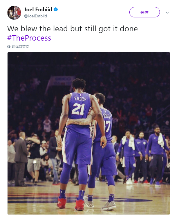 赛后,恩比德也在推特上表达了对赢下比赛的兴奋之情:“我们浪费了领先优势但还是赢了下来。”