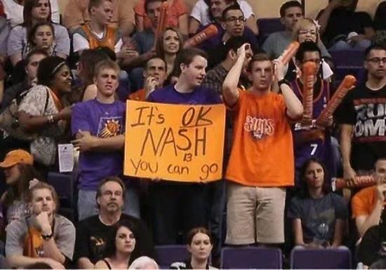 纳什职业生涯在太阳的最后一场比赛,凤凰城内球迷们举起为他做的牌子。没有谩骂,没有嘲讽,唯有祝福,纳什,you can go(你可以走了)。