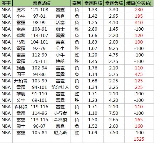 北京时间12月2日,雷霆主场再战森林狼,上演三巨头对飚的好戏。雷霆目前磨合并不顺利,名不副实。在这种状态下,令人吃惊的一幕出现了:前20场比赛,假如场场都买雷霆输球100元,竟能疯狂盈利1500元,简直比国足还稳!见下图。