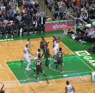 凯尔特人在一次进攻不成之后,米德尔顿抢到后场篮板。此时字母哥已经开始快下,接到队友传球之后,他迈着大步子直接冲向绿军三秒区腹地。尽管斯玛特上前禁区盯防,但是启动加速一气呵成的字母哥,在对手完成扑救之前,高高跃起单手持球,飞身直接完成上篮得分。