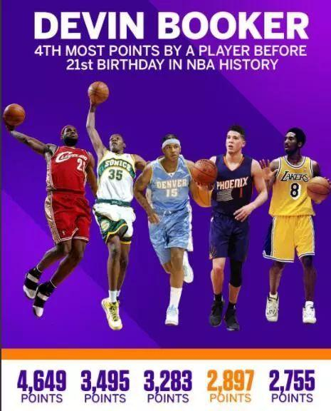 今年10月的最后一天,布克才刚刚年满21岁。他在21岁之前的总得分达到了2897分,已经升至了历史第四,仅次于詹姆斯、凯文-杜兰特和卡梅隆-安东尼。