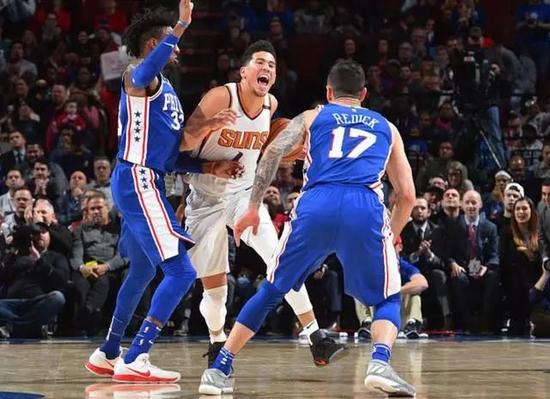 一分钟后,布克在雷迪克接球时突然紧逼,后者掉球。捡到球的布克一骑绝尘,滑翔扣篮。