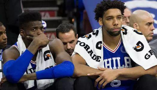 这是一张76人球迷永远都忘不掉的照片。内伦斯-诺埃尔和贾希尔-奥卡福,这对原本应该亲密无间的队友坐在替补席上,满脸都是“同床异梦”的表情。