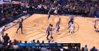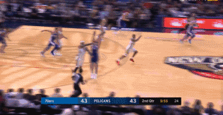 下半场开始后不久,戴维斯展现出了他的防守功力。当时76人的萨里奇在篮下单打戴维斯,萨里奇先做了一个投篮假动作,戴维斯被骗得跳起来。然后萨里奇准备第二次出手,但不料戴维斯的弹速太快,再加上惊人的臂展,结果萨里奇的篮下出手还是被戴维斯扇掉。