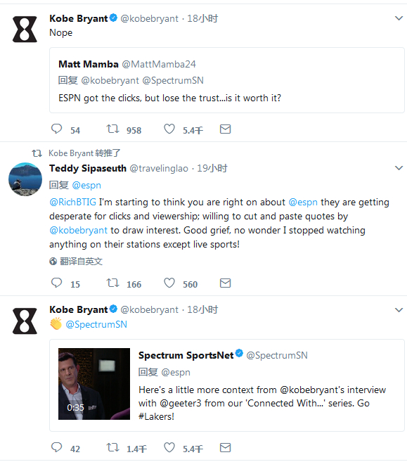 有趣的是,一位网友在推特上写道:“ESPN获得了点击量,但是失去了信任。这么做值得吗?”结果科比转发了这条推特,并写道:“不(值得)。”