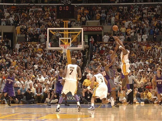伴随着MVP之争,湖人和太阳的首轮对决万众瞩目。前3场战罢,湖人出人意料地以2-1领先。G4第四节还剩8秒时,“死神”斯马什-帕克命中3分,将分差追至2分。随后帕克抢断纳什,科比欧洲步上篮成功,将比赛拖入加时。加时还剩11.7秒时,科比命中2分,将分差迫近到1分,随后裁判判罚沃顿和纳什跳球,科比得球后,风驰电掣跑到前场,命中压哨绝杀。此球得手后,科比也是捶胸大肆庆祝。不过可惜的是,随后太阳连下三城,以4-3逆转湖人。