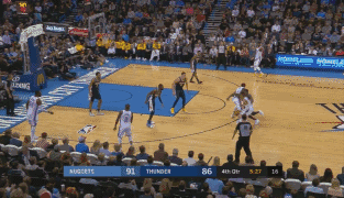 雷霆最后一攻,威少决定突破造成杀伤,虽然差点丢球,但是他在篮下拿回球权,并且在投篮时造成掘金队的犯规。此时距离比赛结束还剩2秒。