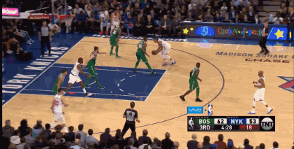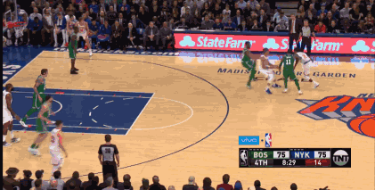 今天的第四节就是比斯利的个人秀,他在前三节得到14分,在波尔津吉斯哑火的时候,他就是球队的主力得分手。而第四节,他10投7中轰下了18分。尼克斯的打法也很简单,就是控卫推进到前场,比斯利在弧顶到罚球弧内侧这个宽度空间内移动,奥奎因在底线徘徊,一旦比斯利拿球他就往里冲,要么获得比斯利的分球,要么冲抢篮板。