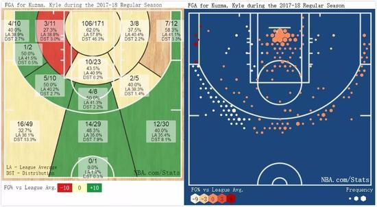 投篮热区上,库兹马鲜有死角,出手主要集中在禁区与三分线外,长两分出手较少,距离篮筐3英尺内,命中率达到了67.5%,3至10英尺的区域为47.1%,三分线外则是40.9%。