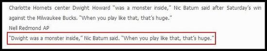 北京时间12月24日,《夏洛特观察者报》在黄蜂击败雄鹿队后采访了霍华德的队友巴图姆,巴图姆对霍华德的评价为:“德怀特在内线里就是一只怪物,他需要打的强硬(出手),他需要有这样的表现,这对球队很重要。”这场比赛霍华德出手11次命中7次,得到21分16篮板2盖帽,他在内线翻江倒海打爆了亨森与梅克,这说明霍华德的战术地位在黄蜂已经很高,他必须要出手,就算命中率低也需要自信的出手,因为他是球队的第二得分点,只有他能发挥优异,黄蜂队才有获胜的希望,所以霍华德就算统治力有所下滑,但他自信心增长,他不怕投失关键球,他敢于出手,敢于背锅,也敢于成为球队英雄,这是前3个赛季看不到的霍华德。