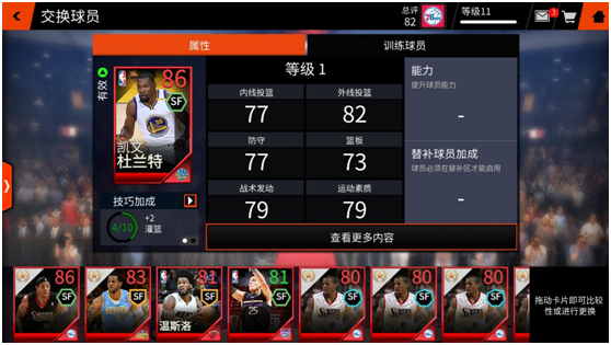 如精英球员凯文•杜兰特,他的各项能力分值比较平均,意味着他的能力发展较为全面。但同时,他在外线投篮方面有略微的优势。