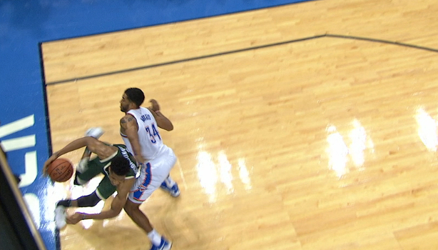 当时距离全场比赛结束还剩4.7秒,字母哥接发边线球,一个大跨步直接过掉防守人。随后威斯布鲁克斜侧里杀出准备协防字母哥,后者腾空展开双臂,顶着威少上演一个摁球得分。安特托孔波的最后准绝杀,为雄鹿锁定了胜局。球进之后,只留给雷霆1.3秒的时间而且没有暂停。