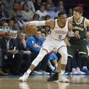 北京时间12月30日,俄克拉荷马雷霆队主场迎战密尔沃基雄鹿,此役雷霆首发控卫拉塞尔-威斯布鲁克表现抢眼,全场出战40分钟,34投16中,三分球9投2中得到最高的40分,外加14个篮板和9次助攻的准三双数据。只可惜他足够强悍足够不讲理,但最终雷霆以95比97不敌雄鹿,结束六连胜。