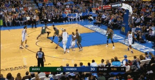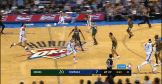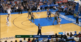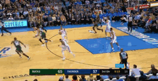 次节6分36秒,字母哥持球背身单打,不料威少从中杀出,直接抢断快攻上演一条龙暴扣得分。